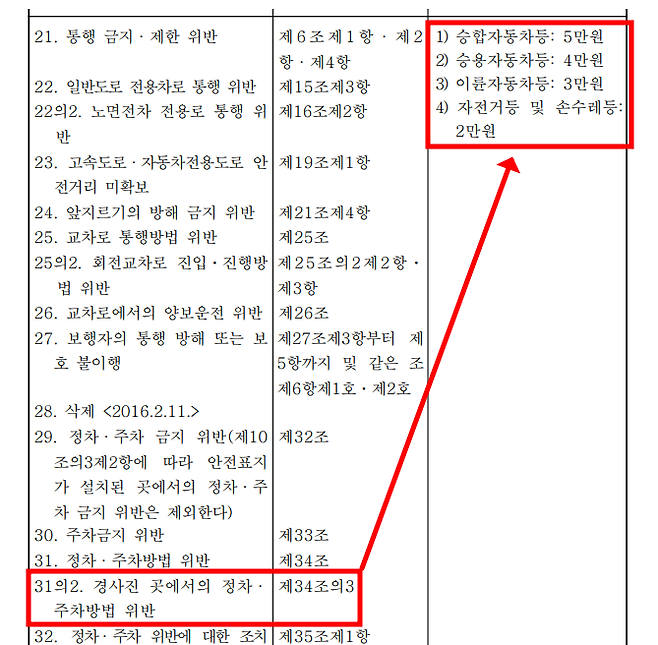법이니 지키지 않았을 때는 그에 응하는 처벌이 있겠죠? 범칙행위 및 범칙금액 31의 2를 보면 정말로 범칙금이 나와 있습니다. 경사진 곳에 주차 올바르게 안하면 승용차는 4만원, 승합차는 무려 5만원을 부과할 수 있는 것이죠.