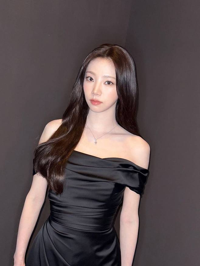 이번 스타일의 핵심은 심플하면서도 세련된 블랙 드레스. 오프숄더 디자인으로 쇄골 라인을 강조하며, 몸에 부드럽게 밀착되는 새틴 소재가 전체적인 실루엣을 우아하게 연출한다. 자연스러운 웨이브를 넣은 긴 머리는 얼굴선을 돋보이게 하며, 여성스러운 분위기를 배가시켰다. 여기에 더해진 미니멀한 실버 네크리스는 군더더기 없이 스타일의 완성도를 높이는 포인트 역할을 했다.