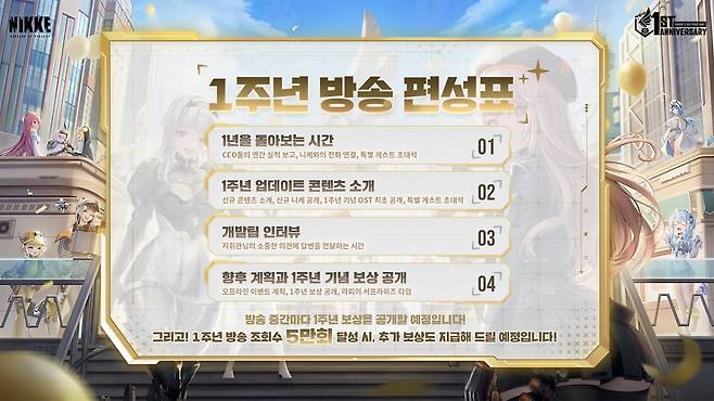 앞서 이야기한 내용 외에도 1주년 기념 특별 방송에서는 기대할 만한 게 많이 있습니다. '1년을 돌아보는 시간', '1주년 업데이트 콘텐츠 소개' 순서에 있는 '특별 게스트 초대석', '향후 계획과 1주년 기념 보상 공개' 순서에 있는 '오프라인 이벤트 계획', '라피의 서프라이즈 타임'이 대표적이죠. 니케팀이 이번 1주년에도 지난 0.5주년처럼 많은 것을 준비하고 있다는 것이 느껴집니다.