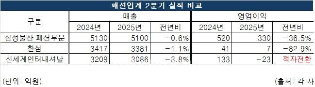 [이데일리 김지우 기자] 소비심리 위축 등 여파로 국내 패션업계가 올해 2분기에도 실적 부진을 이어갔다. 삼성물산(028260) 패션부문, 한섬(020000), 신세계인터내셔날(031430) 등 주요 업체들의 매출은 일제히 감소했고, 영업이익도 두자릿수 감소하거나 적자전환했다. 해외 시장 확대, 화장품(뷰티) 사업 강화 등을 돌파구 삼아 실적 반등에 안간힘을 쓰고 있지만 상황은 녹록지 않아 보인다.