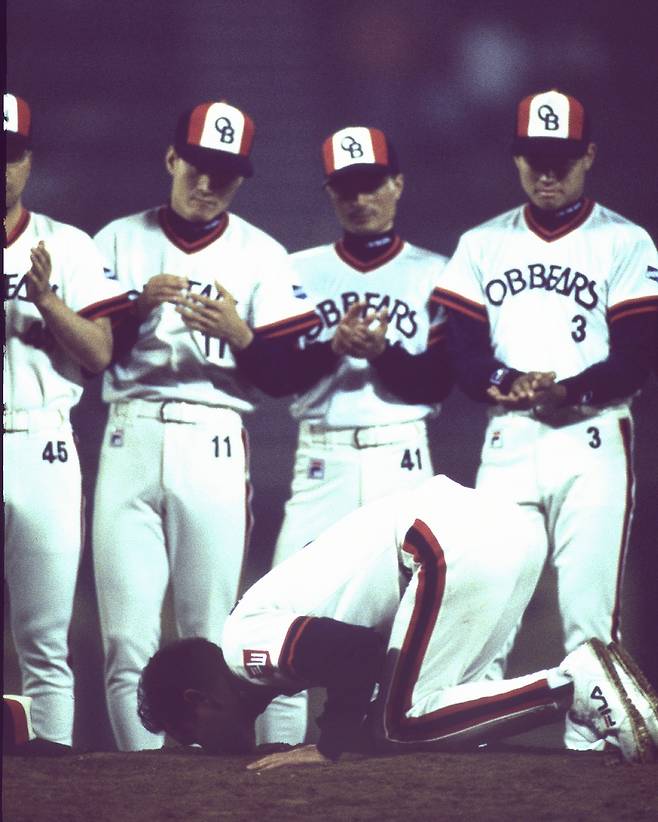 경기 후 프랭크 시내트라의 노래 ‘마이웨이’가 울려퍼진 가운데 ‘불사조’ 박철순은 마운드에 엎드려 ‘마운드 키스’를 했다. LG 주장 노찬엽도 꽃다발을 전해주며 전설이 떠나가는 마지막 순간을 축하해줬다.