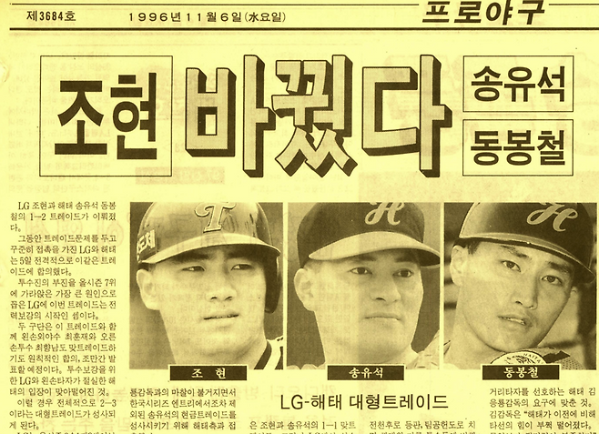 LG는 해태에서 우완투수 송유석과 좌타자 외야수 동봉철을 데려오면서 우타거포 유망주 조현을 내주기로 했다. 곧이어 좌타자 최훈재를 해태에 주면서 ‘미완의 대기’ 투수 최향남을 받는 트레이드까지 합의했다. 사실상 3대2 트레이드였다.