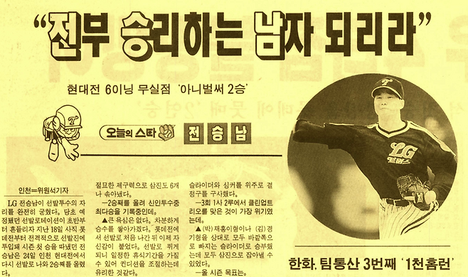 임선동은 프로 데뷔전인 이날 선발로 나서 5.2이닝 6실점으로 쓴맛을 봤다. 하지만 이병규가 4타수 3안타 3타점으로 ‘LG 킬러’인 해태 선발 조계현을 무너뜨리면서 연장 10회 7-6 승리의 수훈갑이 됐다.