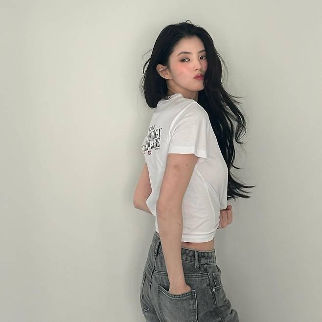 사진 속 한소희는 흰티셔츠에 흑청바지를 입고 청순한 미모를 뽐내고 있습니다.