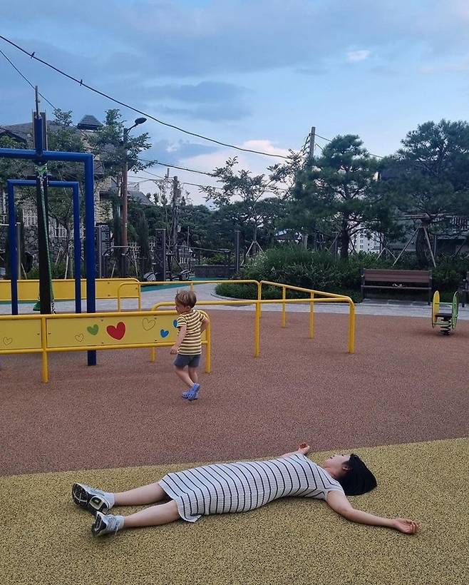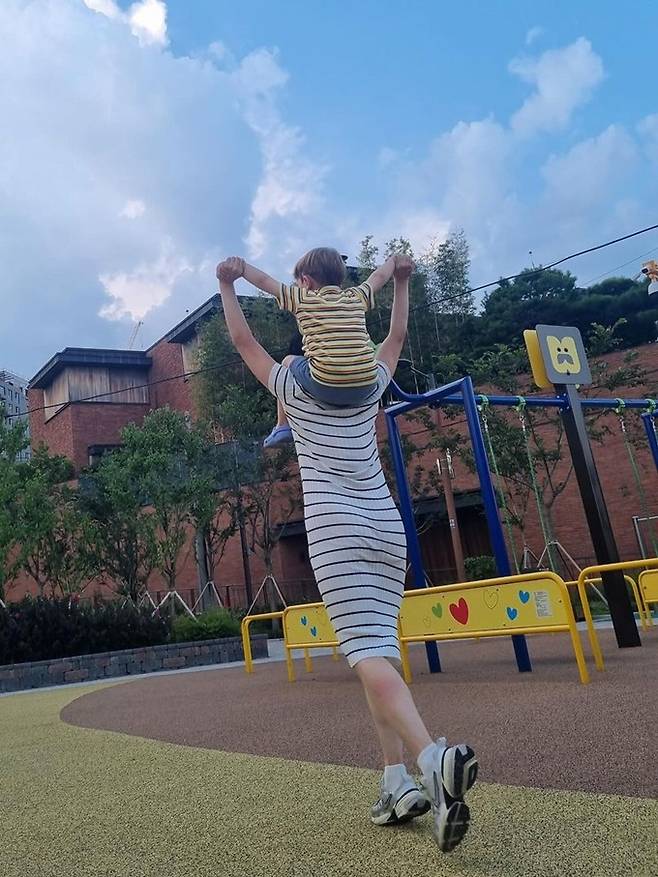 방송인 사유리가 아들 젠과 다정한 스트라이프 모자 커플룩으로 공원 산책을 즐겼다.