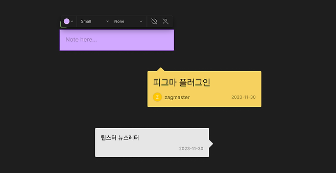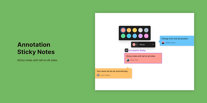 오늘 소개할 첫 번째 플러그인은, 원하는 위치에 빠르고 간편하게 메모를 남길 수 있도록 도와줘요. 텍스트 입력을 위한 공간을 따로 만들지 않아도 되고, 코멘트와 같은 연속성이 있는 내용까지 필요하지 않은 경우 특히 유용하게 활용할 수 있어요.