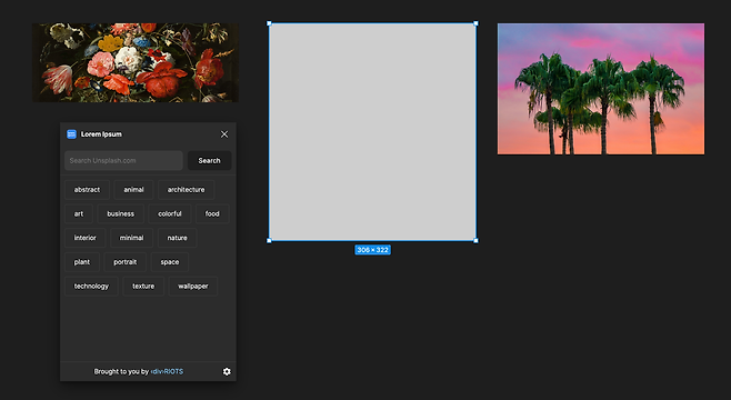이미지를 먼저 넣어볼까요? 이미지를 채울 곳을 지정한 뒤 플러그인을 실행하면 동물, 자연, 우주, 식물 등의 키워드를 볼 수 있고, 특정 키워드를 선택하면 이미지 리스트를 확인할 수 있어요. 원하는 이미지를 선택하면 영역에 맞게 이미지가 바로 적용되죠. 키워드는 직접 입력, 검색을 통해 이미지를 찾을 수도 있어요.