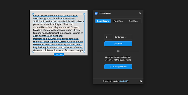 텍스트는 두 가지 방법으로 채울 수 있는데 하나는 문장 수를 기준으로 넣는 방법 또 하나는 선택한 영역에 알맞게 내용을 생성해 채우는 방법이에요. 개인적으로는 프레임에 맞게 알아서 채워주는 기능이 좋았는데, 작업중인 화면 속 영역에 텍스트가 꽉 찼을 때의 모습을 빠르게 볼 수 있기 때문이에요.