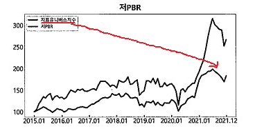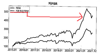 밸류 팩터 중의 하나인 ‘PBR’과 지표 팩터가 결합했을 때 결과를 보겠습니다. 많은 퀀트 관련 연구와 서적을 통해 시장에서 PBR(주가순자산비율, Price Book Value Ratio)이 낮은 주식을 사는 것이 PBR이 높은 주식을 사는 것보다 높은 수익을 안겨 주는 것으로 알려져 있습니다. 물론 저PBR주를 선택하는 것이 어느 시기 혹은 어떤 기간에나 늘 이길 수 있는 전략이라고 말할 수는 없습니다.