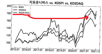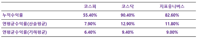 약간의 성과 차이는 있지만, 세 지수 모두 비슷한 수익률입니다. ‘지표유니버스 지수’는 코스피 지수 수익률보다 나았고 코스닥 지수 수익률과 비슷했습니다.