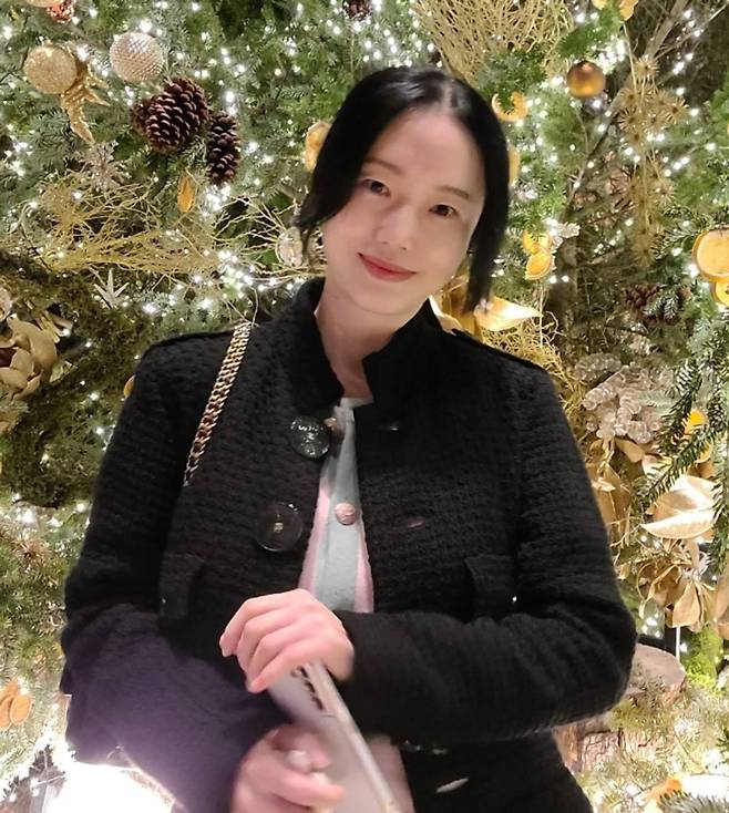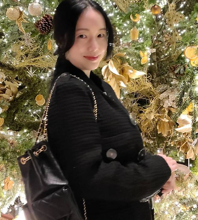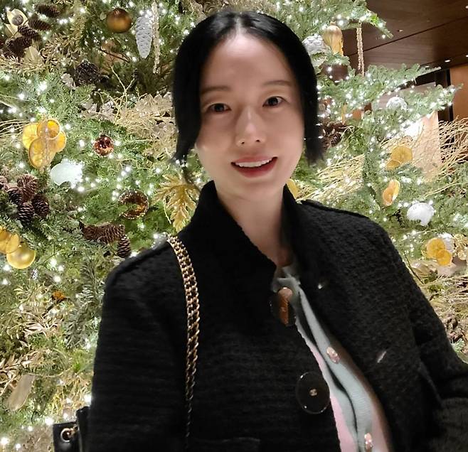 이정현은 화려한 트리 앞에서 핑크색 카디건에 검은색 트위드 재킷을 입은 모습으로 카메라를 바라보고 있다.