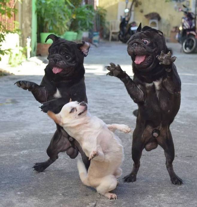 검은색 퍼그 두 마리는 벌써 흥이 머리끝까지 차올랐는지, 뒷발로 당당하게 서서 앞발을 휘저으며 화려한 스텝을 밟기 시작했습니다.