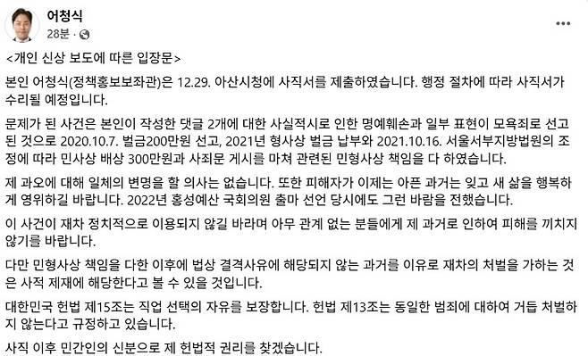 | ▲ 어씨는 29일 자신의 페이스북에 "12월 29일 아산시청에 사직서를 제출했다. 행정 절차에 따라 사직서가 수리될 예정"이라고 밝혔다. |