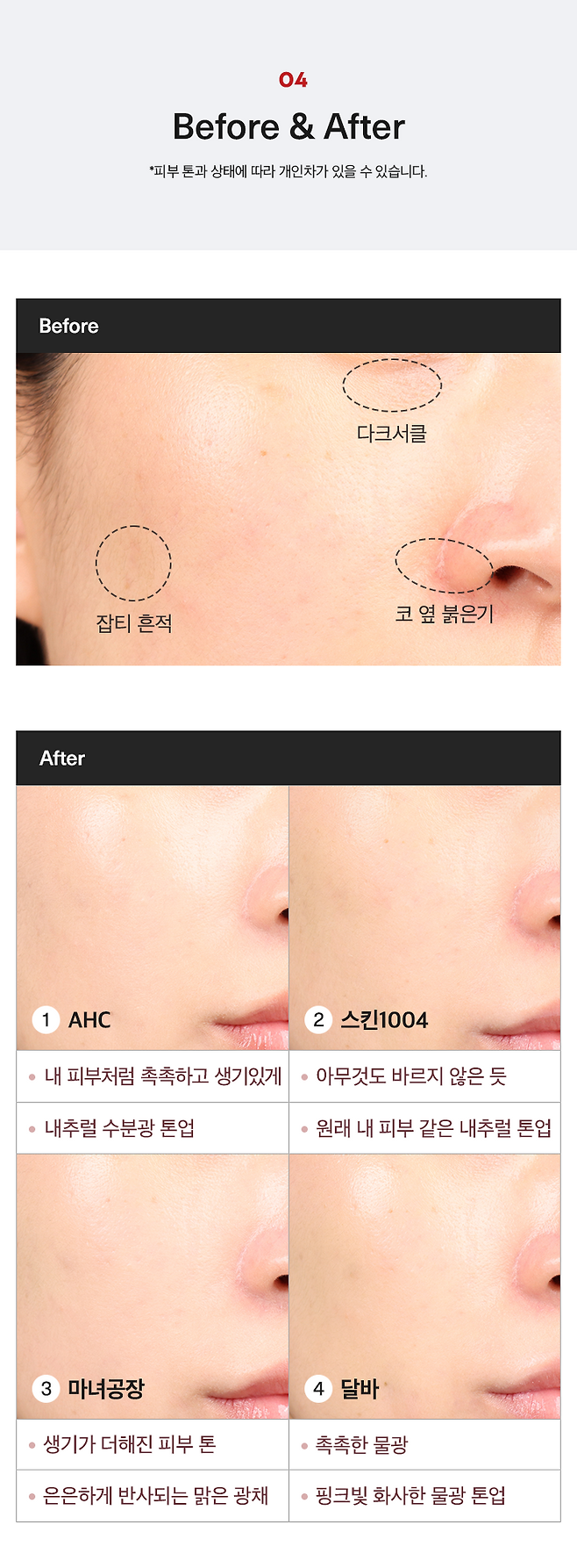 AHC와 마녀공장 제품이 자연스러운 톤업과 수분감 있는 광채까지 연출해 주었는데요. 특히 AHC 제품이 피부 톤과 가장 비슷한 컬러로 잡티, 다크써클을 자연스럽게 커버해 주는 것을 확인할 수 있었어요.