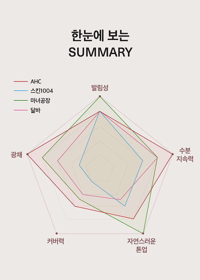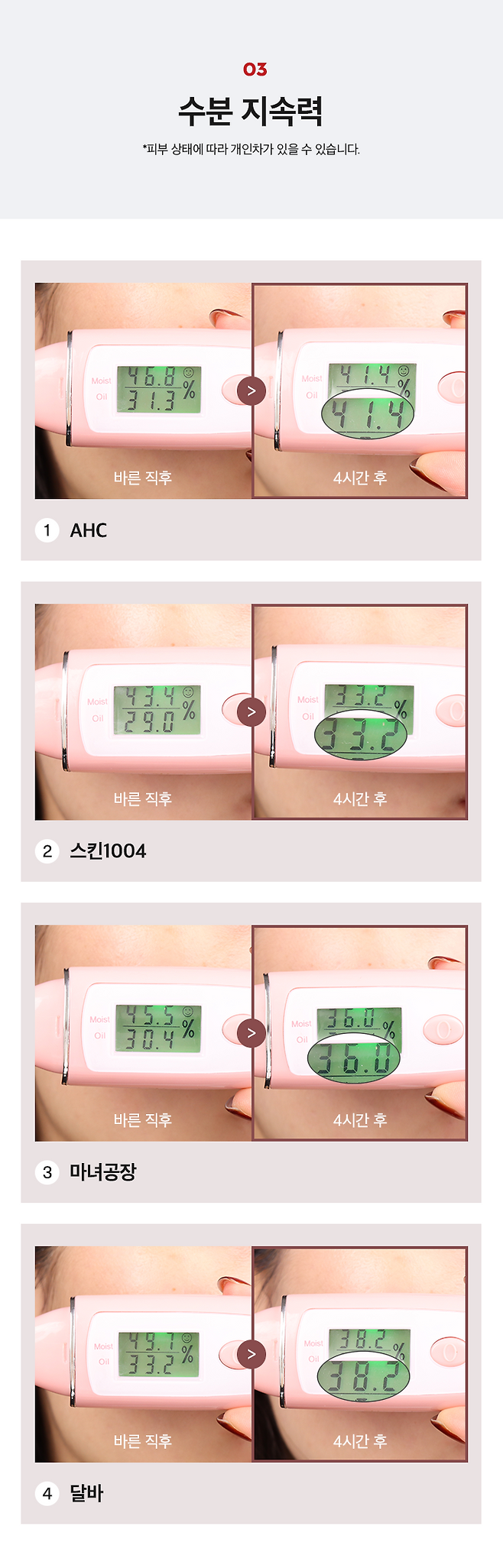 AHC 제품을 발랐을 때 피부가 가장 편안하고 건조함도 없었는데요. 시간이 지난 후 수분도를 측정해 보니 역시나! AHC의 수분이 가장 높게 유지되는 것을 확인할 수 있었어요. 마녀공장과 달바 제품 역시도 사용 후 건조함이나 피부 당김은 느껴지지 않았어요.