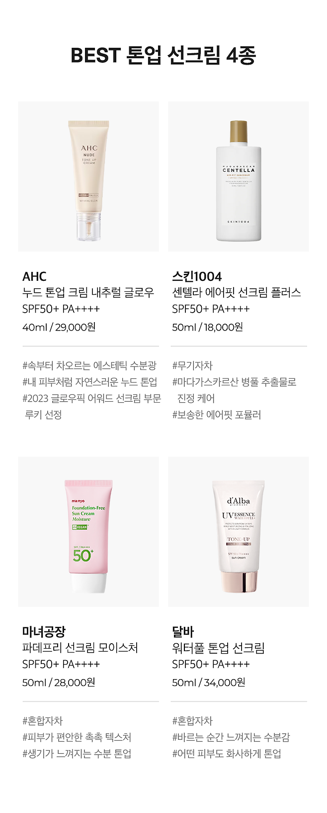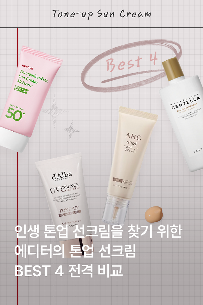바쁜 아침에 베이스 대신 간편하게 사용할 수 있는 톤업 제품을 찾고 있는 에디터. 자연스러운 톤업 효과는 물론 자외선 차단까지 가능한 제품 어디 없을까요? 에디터의 인생 톤업 선크림을 찾기 위해 후기 좋기로 유명한 톤업 선크림 4종을 직접 비교해 봤어요.