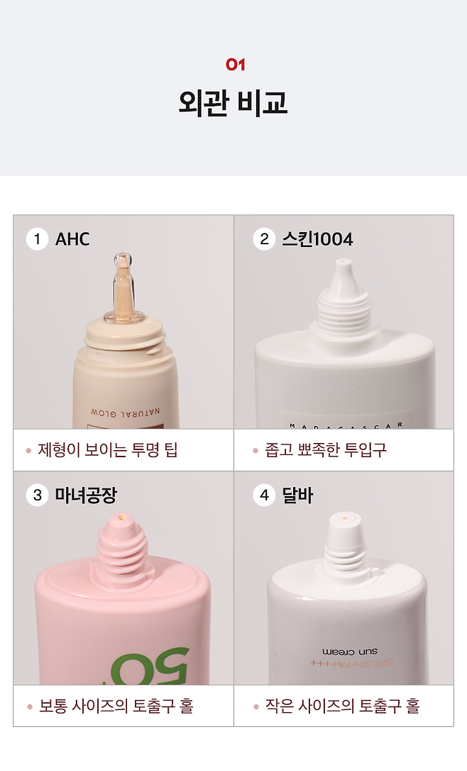 토출구가 짧은 제품을 쓰다 보면 양 조절이 어려워 결국 남은 양을 티슈로 닦아내야 하는 번거로움이 있었는데, AHC와 스킨1004 제품은 토출구가 좁고 길쭉한 타입이라 필요한 양만 딱 사용할 수 있어 편리했어요. 특히 AHC의 톤업 선크림은 팁 길이가 긴 편이라 좁은 스팟에 섬세하게 발라주기에도 좋은데요. 사용 후에는 팁만 쏙 닦아주면 되니 깔끔하게 사용할 수 있었어요.