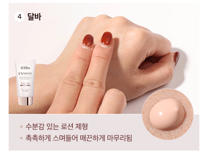 제형만 보았을 땐 달바의 워터풀 톤업 선크림이 가장 수분감 많을 것 같아 보였는데, 막상 발라보니 AHC와 마녀공장 제품이 바르는 순간부터 흡수될 때까지 촉촉하더라구요. 특히 AHC는 손으로만 발라도 들뜸 없이 밀착될 정도! 스킨1004 제품은 상대적으로 수분감이 적게 느껴졌지만 타 무기차자 제품보다는 부드럽고 촉촉한 편이었어요.