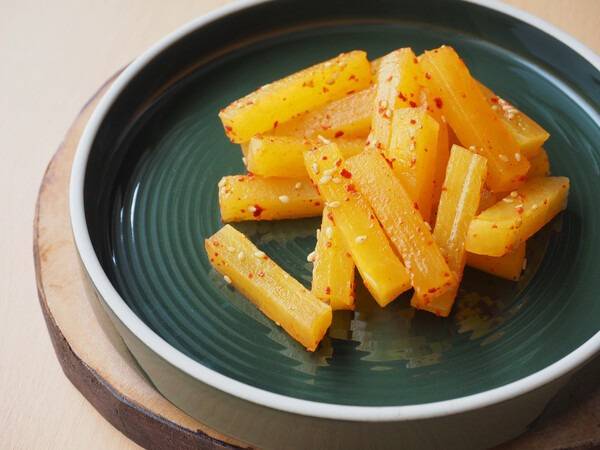 단무지는 새콤달콤한 맛과 아삭한 식감으로 김밥, 도시락, 분식 등에 자주 등장하는 반찬입니다.