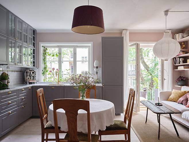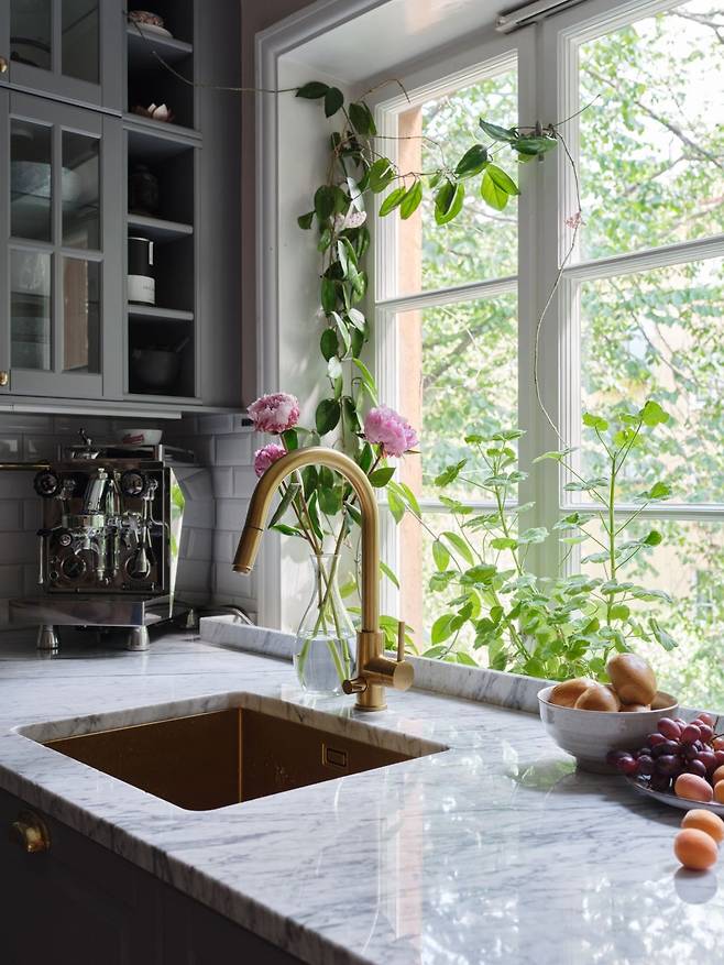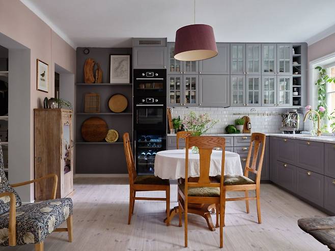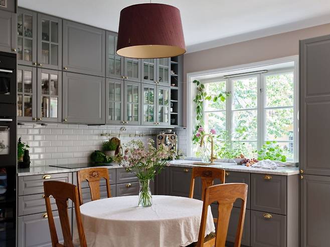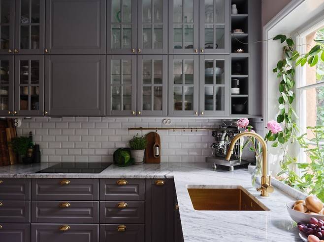 주방 전체는 차분한 차콜 그레이 컬러로 마감되었지만, 무겁지 않게 화이트 상판과 대리석 타일로 균형을 맞췄다. 상부장과 하부장의 깊은 톤은 고급스러움을 더하고, 주방 창에는 넝쿨 식물로 플랜테리어를 더해 생기를 불어넣었다. 원형 테이블과 우드 의자도 따뜻한 분위기를 더한다.