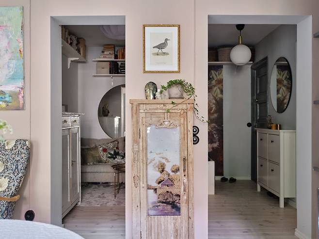 주방에서 연결된 베란다는 조립식 데크와 벤치로 꾸며져 작지만 아늑한 야외 공간이 되었다. 현관 옆에는 벤치를 두어 실용성과 스타일을 챙겼다. 작은방에는 소파와 수납장을 활용해 TV 공간으로 재탄생시켰고, 수납선반까지 더해 공간 효율을 극대화했다.