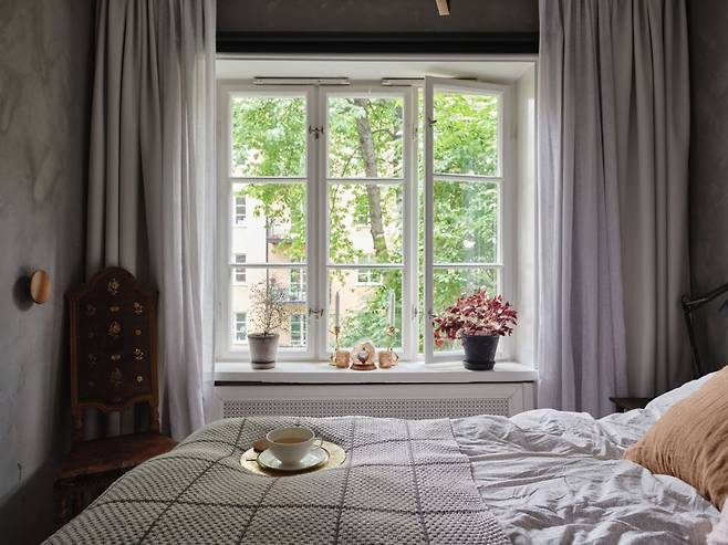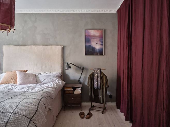 침실은 벽에 포인트 컬러 없이 베이지 톤으로 통일했다. 헤드가 높은 침대와 커튼으로 가린 옷장이 전체 분위기를 차분하게 정돈한다. 옷장 문 대신 커튼을 사용하면 계절에 따라 손쉽게 분위기를 바꿀 수 있어 실용성과 감성을 모두 잡을 수 있다.