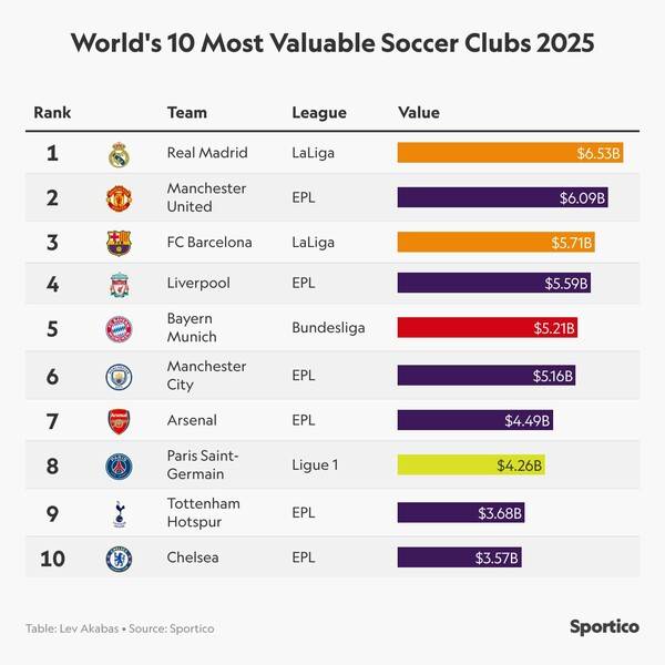 스포츠 산업을 주로 다루는 매체 ‘스포티코’는 “세계에서 가장 가치가 있는 축구 클럽 TOP10을 선정했는데, 10개 팀 중 6개 클럽이 프리미어리그 소속이었다. 그러나 1위는 스페인 라리가의 레알 마드리드였다”고 공개했다.