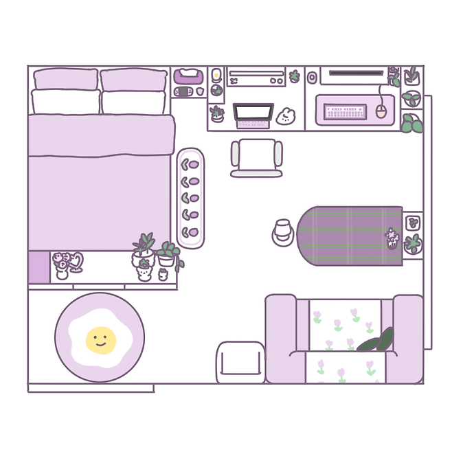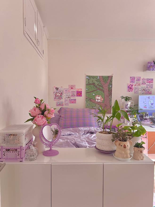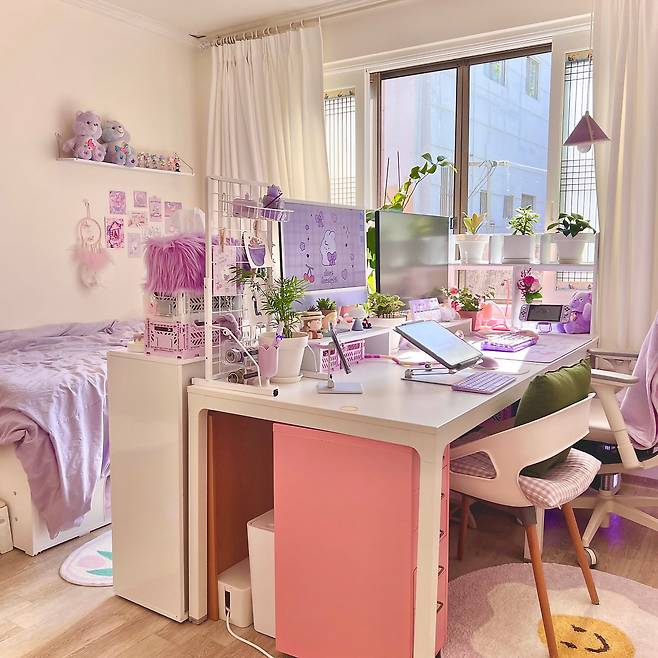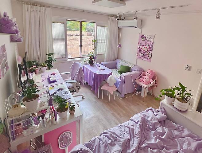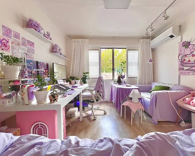 큰 방은 크게 5가지 구역으로 분류되어 있어요. 화장대 공간, 작업 공간, 그다음은 다이닝 공간, 수면 공간, 마지막으로 드레스룸 공간으로 분류되어 있답니다. 보라색과 분홍색을 좋아해서 주 포인트는 보라, 포인트 컬러는 핑크와 그린으로 잡고 방을 꾸미고 있어요.