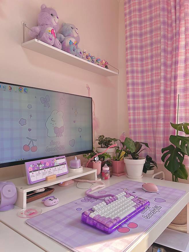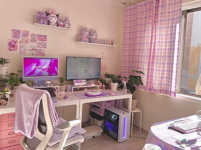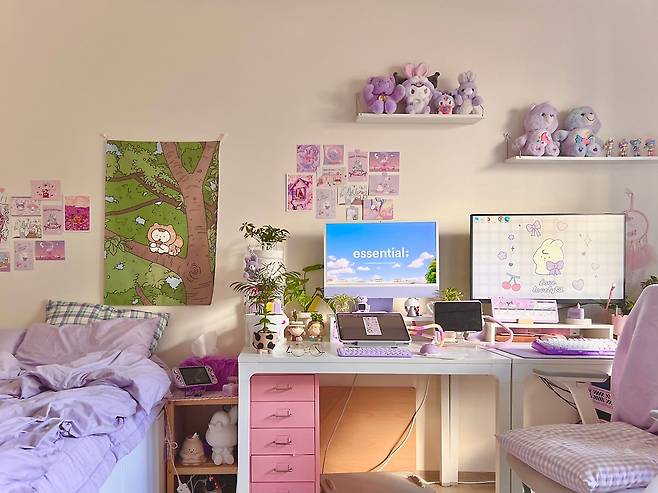 책상과 벽에 귀여운 소품들이 보이시나요? 제가 귀엽고 아기자기한 걸 좋아해서 피규어나 인형 소품 등을 모아두었어요. 그중에서 몇 개는 좋아하는 작가님의 캐릭터나 혹은 제가 그린 일러스트로 제작한 소품이랍니다.