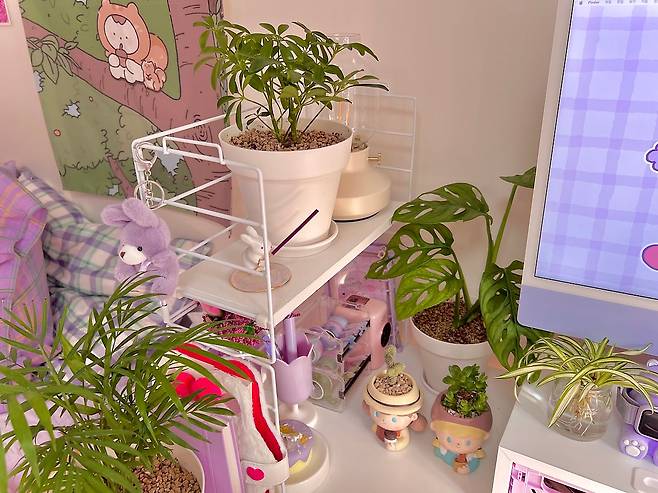 얼마 안 된 취미이긴 하지만 식물 키우는 것도 좋아해서 집에 식물이 점점 많아지고 있어요. 제가 원래 식물 똥손이거든요. 그러다 어느 날 몬스테라가 이뻐 보여서 하나 데려왔는데, 이 친구가 안 죽고 신엽을 쑥쑥 내주는 거예요! 그때의 뿌듯함으로 자신감도 붙고 공부도 하면서, 열심히 초록이들을 키우고 있어요. 나름 빛을 많이 봐야 하는 아이와 적게 봐도 되는 아이, 통풍이 많이 필요한 친구들 자리를 정해서 자리를 정해주었답니다.