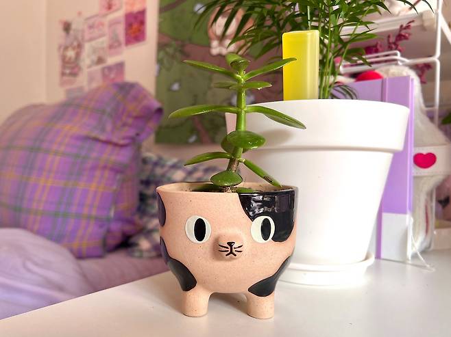 식물 키우는 걸 좋아하다 보니 포인트 되는 귀여운 화분들도 조금씩 구매하고 있어요. 이 화분은 얼롱사이드에서 구매한 젖소 뚱냥팟인데 다음엔 삼색이도 데려오고 싶어서 눈독 들이고 있네요.
