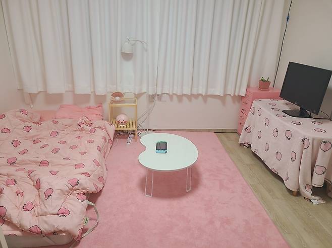 인테리어 분위기를 바꾸는데 가장 좋은 건 패브릭인 것 같아요. 원래 화이트 커튼을 사용하다가 최근에 커튼을 바꿨는데 하이틴 영화의 여자 주인공 방처럼 귀엽고 상큼한 느낌이에요.