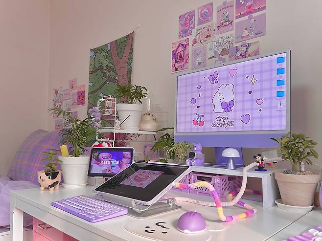 저는 컴퓨터가 두 대 있는데요. 취미가 게임이라 원래 데스크톱만 사용했었는데, 예전에 한 번 크게 고장 나서 며칠 아무것도 못하고 작업 파일이 날아갈까 봐 노심초사 한 이후로 서브 컴퓨터의 필요성을 느꼈어요. 사용하던 아이패드와 작업용 프로그램의 호환성을 고려해 아이맥 m1 퍼플을 구매했었는데요, 이때를 기점으로 핑크에서 보라색으로 취향이 바뀌었답니다.