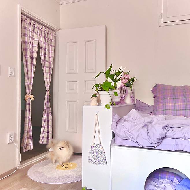 저는 ‘뽀짜’라는 귀여운 강아지와 같이 살고 있는데, 강아지가 왔다 갔다 해야 하기 때문에 문을 항상 열어둬요. 그런데 밖에서 방 안이 훤히 보이면 마음이 조금 불안해서 침대를 항상 안쪽에 두다가 이번엔 과감하게 입구에 배치했어요. 방 안쪽이 보이는 게 싫다면 인테리어로 시선을 차단하면 되니까요!