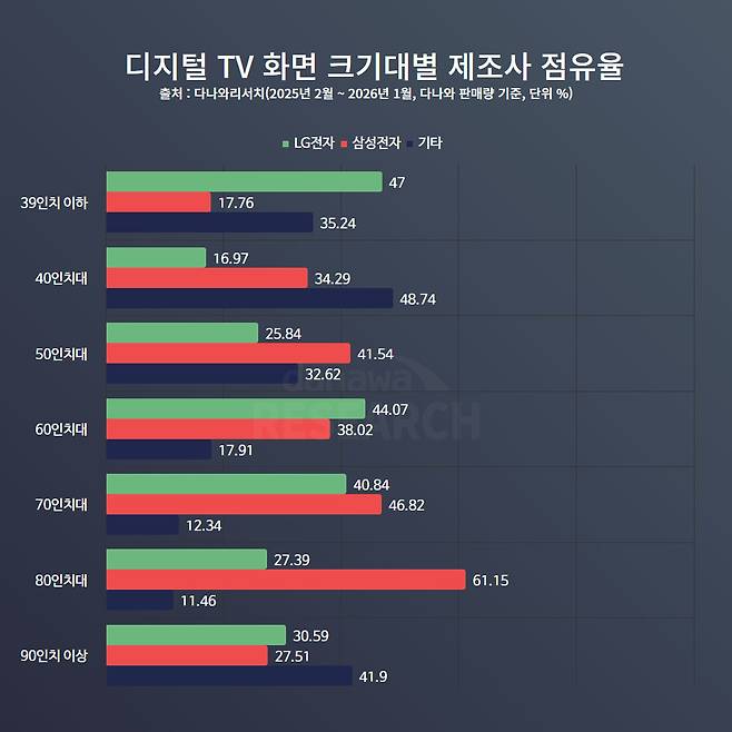 과도기적인 점유율을 보이는 50인치대를 넘어 60~70인치대로 넘어오면 형세가 많이 달라진다. 이 구간은 판매량이 가장 많은 메인급 시장으로, 삼성전자와 LG전자의 양강 구도가 본격적으로 형성된다. 가격도 화면 크기만큼 비싸지므로 무조건 가성비만 추구하는 것이 아니라 브랜드의 신뢰도, 제품 완성도까지 중요한 요소로 작용하면서 삼성, LG의 존재감이 극대화되는 것이다.