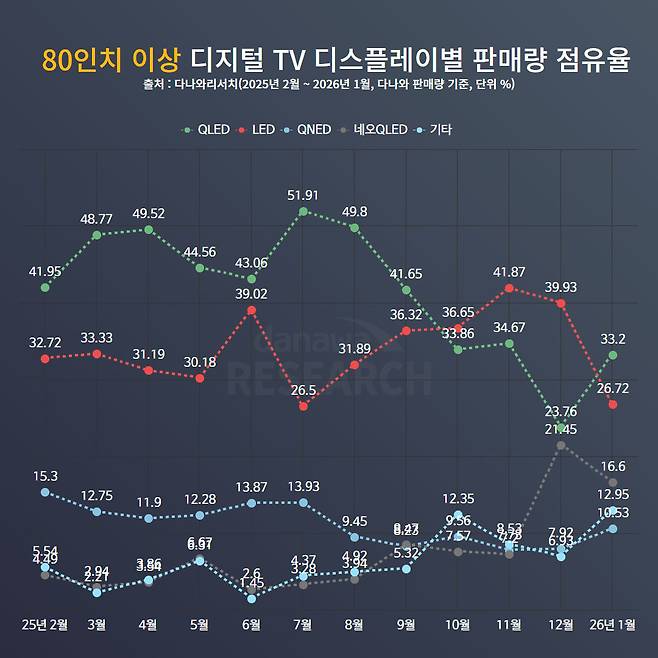 #QLED의 몰락 80인치 이상 대형 TV 시장의 재편은 디스플레이 종류의 변화에서도 확인된다. 2025년 상반기까지만 해도 QLED 방식은 80인치 이상 시장에서 40~50%대 점유율을 유지하며 나름 존재감이 컸다. 그러나 하반기로 접어들면서 QLED 방식의 비중은 점진적으로 하락했고, 상대적으로 가격 부담이 적은 LED 방식이 30% 후반에서 40%대까지 확대됐다.