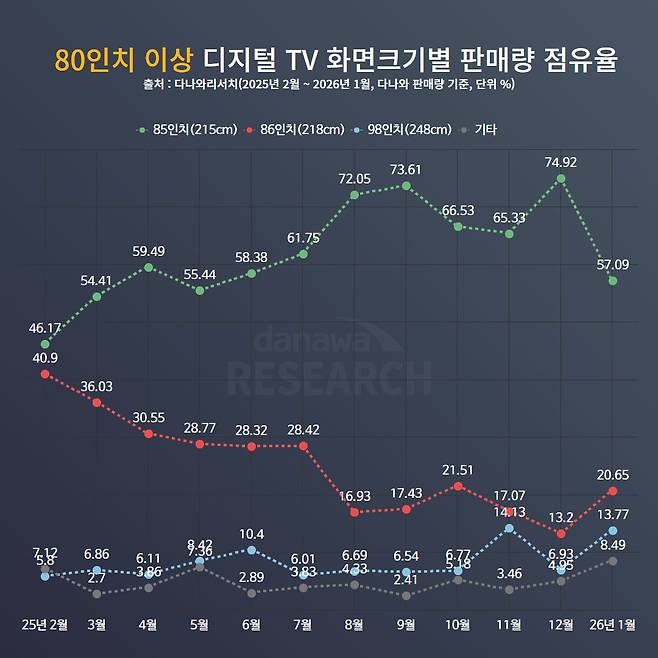 #85인치가 뜬다 80인치대에서 나타난 삼성전자의 강세는, 이 시장을 사실상 양분하고 있는 85인치와 86인치 제품군의 재편 과정에서 찾을 수 있다. 2025년 초만 해도 두 사이즈는 비슷한 비중으로 경쟁 구도를 형성했지만, 시간이 지날수록 85인치 제품의 점유율이 빠르게 확대되며 2025년 말에는 74.92%까지 상승했다.