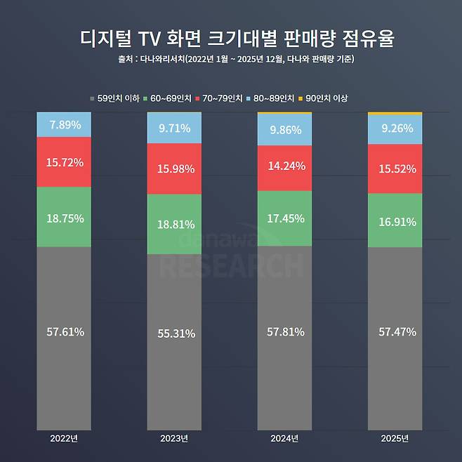 하지만, 59인치 이상 대형 TV를 60인치대, 70인치대, 80인치 이상으로 상세히 나누어 보면 흥미로운 경향이 나타난다. 우선 60인치대와 70인치대는 각각 16~18% 수준의 점유율을 꾸준히 유지하며 큰 변동이 없다. 반면 80인치 이상 제품군은 7.89%에서 최고 9.86%까지 오르는 등 홀로 완만한 상승세를 이어가며 2025년을 9.26%로 마감했다.