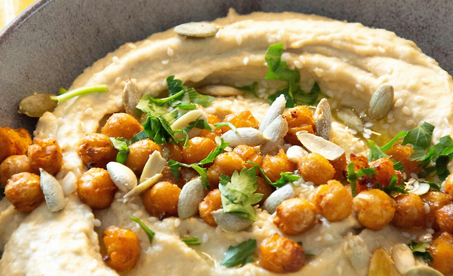 병아리콩은 부침개뿐 아니라 후무스에도 빠질 수 없죠! 병아리콩을 삶아서 올리브유, 레몬즙, 소금, 마늘 살짝만 더하면 저칼로리 고단백 디핑소스가 완성돼요. 빵 대신 당근, 오이 같은 채소스틱 곁들이면 달달한 콜라 대신에도 손색 없는 건강간식 완성이에요.