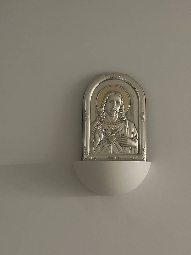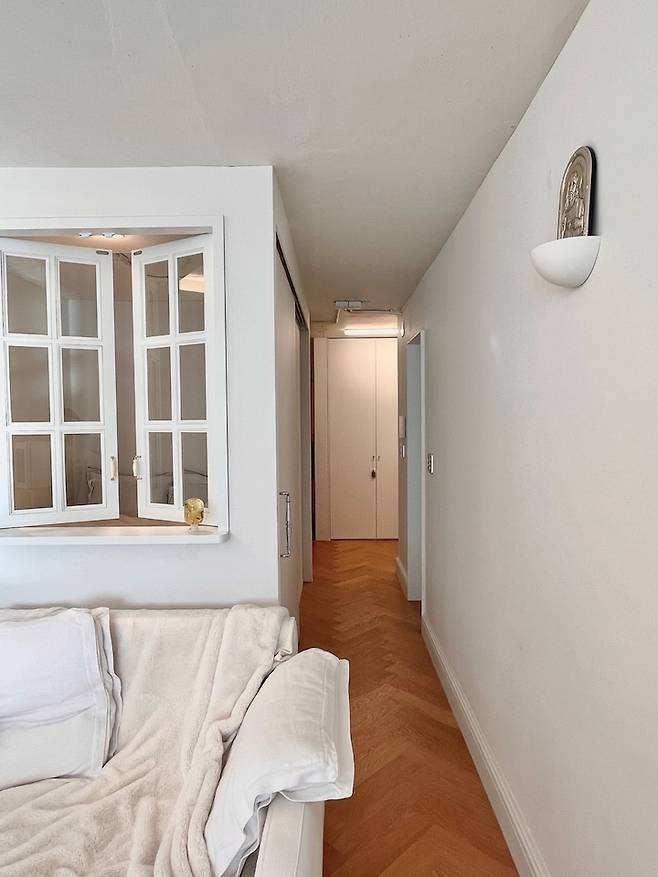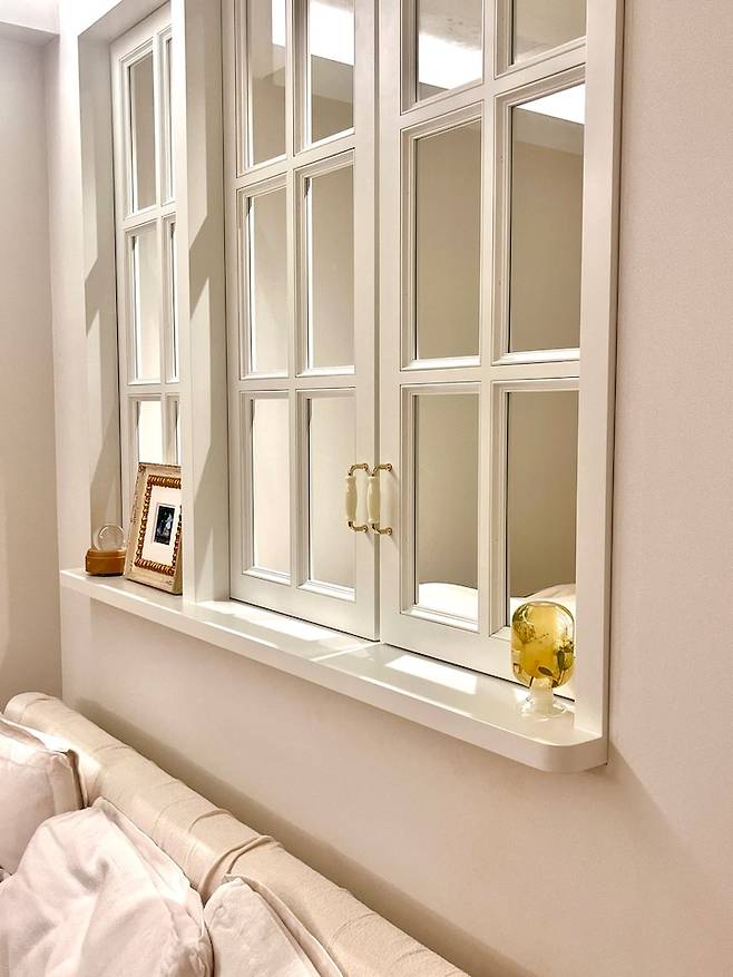 창문 앞에 작은 선반 턱을 디자인해 여기에 의미 있는 오브제로 꾸며 봤어요. 신혼여행 때 이탈리아에서 사온 그림 액자와 연애 시절 의미가 담긴 크리스마스 트리 오르골을 두고 오른 쪽 유리 오브제는 부케 받은 친구가 예쁘게 오브제로 만들어 받은 선물이랍니다. 복도 지나갈 때마다 스-윽 보면 기분이 좋아져요.