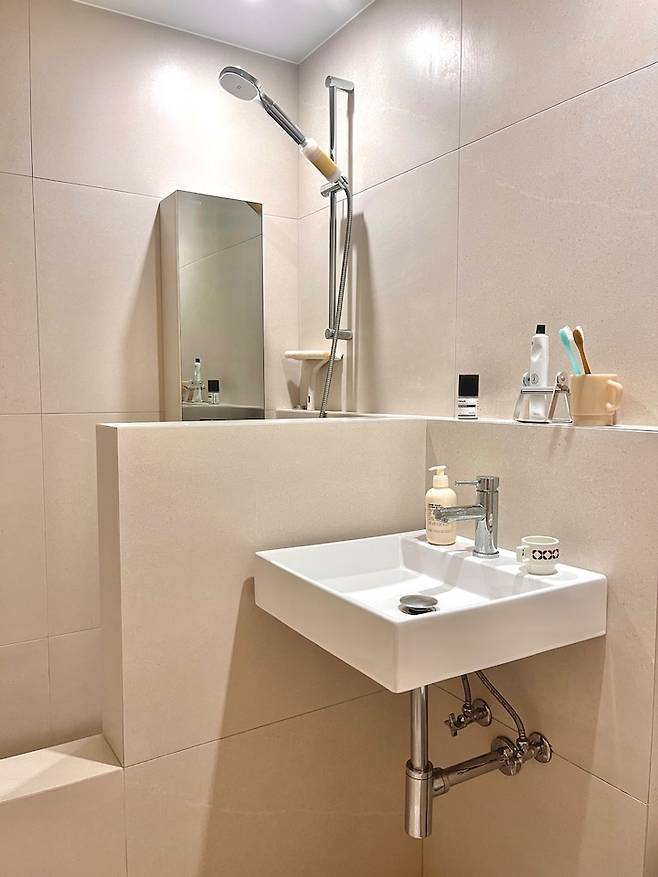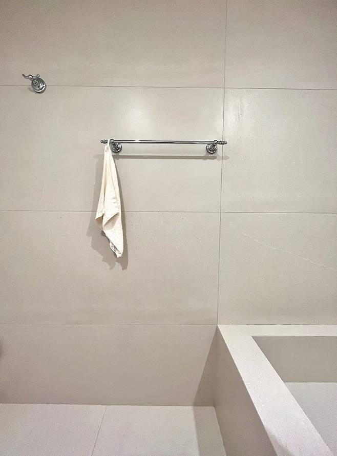 욕실은 최대한 심플하게 청소하기 쉽게 시공했어요. 저희는 화장실에 따로 거울이나 수납렉을 두지 않았어요. 손수건만 걸어두고 샤워타월은 샤워할 때 드레스룸에서 챙겨간답니다.