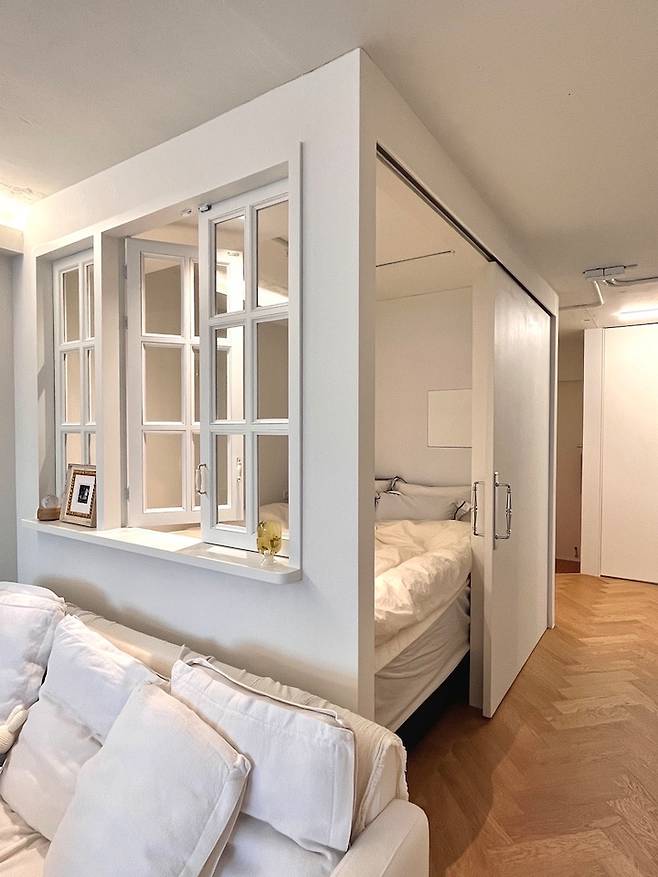 기존의 부엌 공간은 아늑한 침실로 쓰고 있어요. 제가 원하는 느낌의 목창으로 거실과 이어주며 답답하지 않게 창문을 만들어주고, 슬라이딩 도어로 없던 방을 만들었습니다!