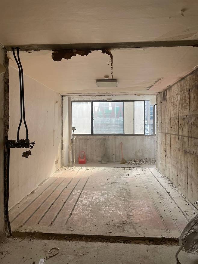 천장은 과감하게 노출 천장으로 답답해 보이지 않게 하고, 오래 전부터 로망이었던 바닥은 헤링본으로 하였답니다. 걸레받이는 일반적으로 사용하는 걸레받이보다 높은 디자인으로 택했어요.