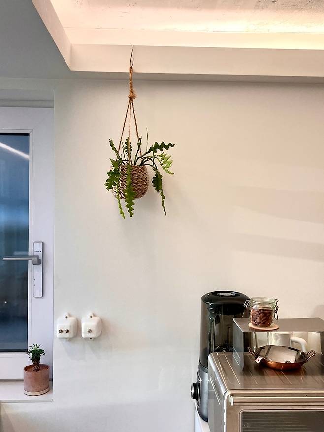 천장에 매입등 홈에 행잉 식물을 걸어두니 부엌 분위기가 한층 더 활기찬 것 같아요. TMI를 하자면 식물이름은 '감자'에요. 감자탕 먹으러 가는 길에 데려온 피쉬본이라는 아이입니다 :)