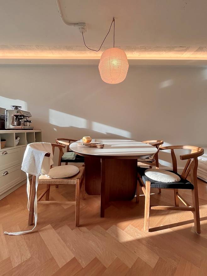 저희 부부가 가장 많은 시간을 보내는 식탁과 소파 공간을 소개드릴게요! 식탁 등은 모든 가구가 들어오고 분위기에 맞춰 구매해야겠단 생각으로 식탁, 소파 모두 배치된 후 달았어요. 편안한 분위기로 만들어 주는 것 같아요.