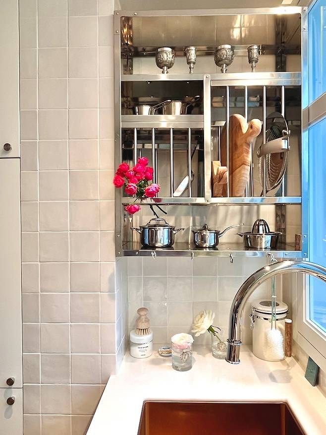 싱크대 좌측 타일 벽에 설치한 키친랙을 두고 자주 사용하는 것과 디피용이 어우러져 있어요. 자주 사용하는 도마(과일사용 나무 도마)와 후라이팬 덮개 뚜껑, 계량컵 정도 사용해요. 미니 후라이팬과 냄비는 드부이에 제품인데 오래 전에 사왔던 거라 정확한 제품명을 찾을 수가 없네요.