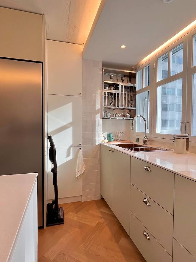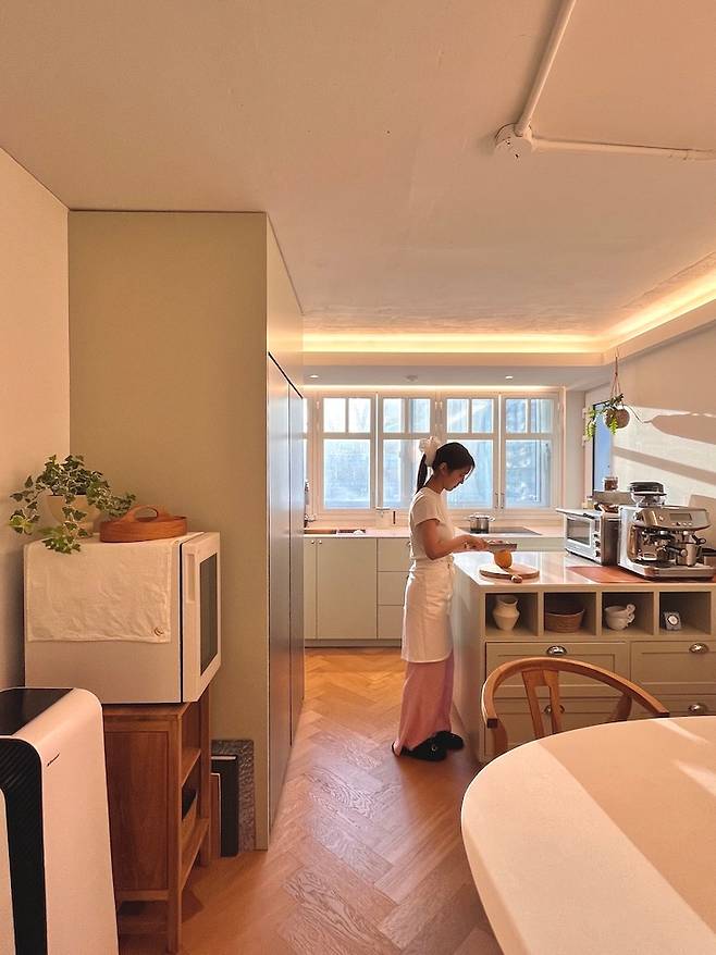 중앙 벽을 철거하고 부엌 공간을 최대한 확보하였어요. 작은 방에 창문이 없기 때문에 하나 뿐인 창문을 집에 있는 시간 동안 마음껏 누리고 싶었어요. 2중 창문에 디자인 목창을 더하여 여름에는 햇빛 맛집이 되고, 겨울엔 따듯하지만 답답하지 않은 분위기를 유지할 수 있어요.