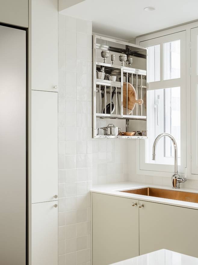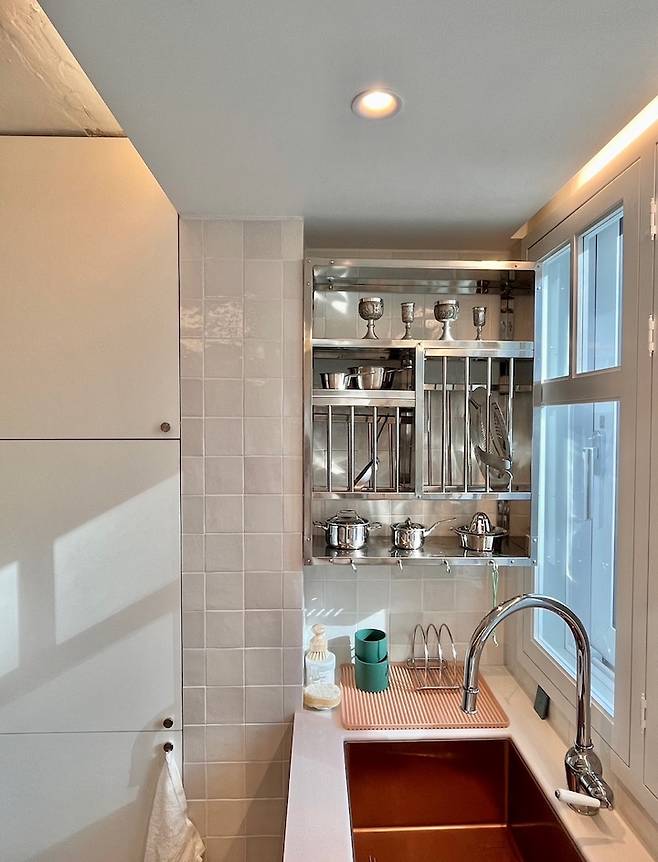 싱크볼은 로즈골드 색상으로 하고 수전은 굳이 같은 컬러로 맞추지 않았어요. 수전까지 골드로 가면 손잡이도 골드로 맞춰야 할 것 같은 느낌이 들어서요. 골드는 앤틱한 느낌이 좋은데 오래된 느낌의 수전이나 손잡이를 고를 만큼 용기가 크지는 않았던 것 같아요 ^^ 저는 주방에 실버 제품을 선호해서 노출되는 부분은 대부분 실버 색상으로 맞춰진 것 같아요.