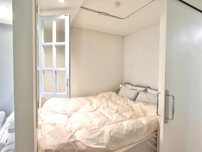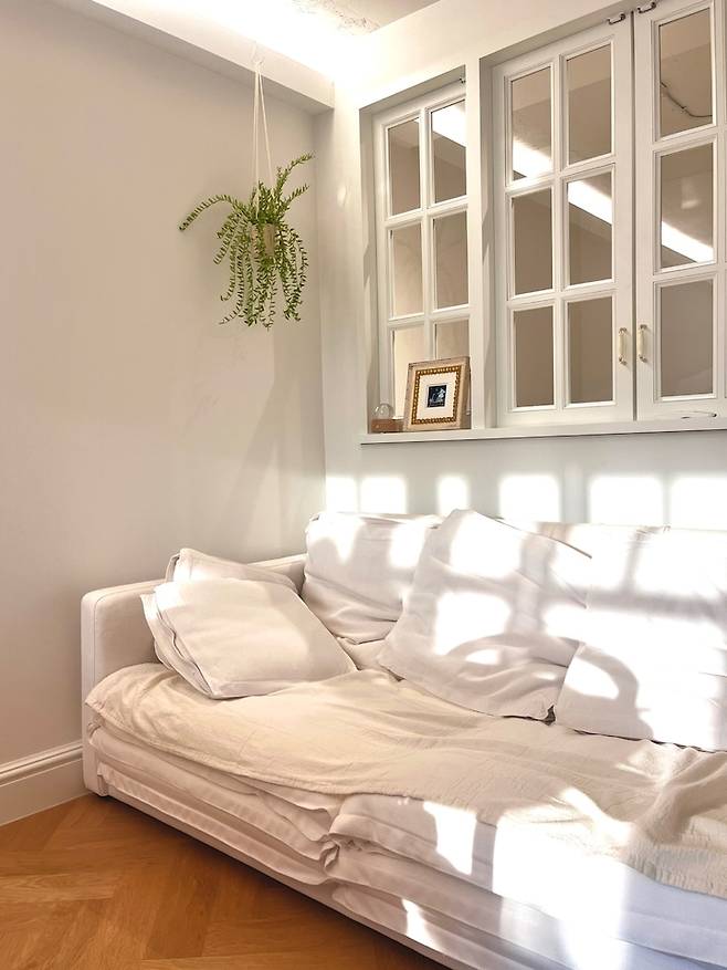 침실의 공간이 기존에는 부엌이였다는 사실..! 창문과, 슬라이딩 도어로 아늑한 침실이 되었답니다. 수면에만 집중할 수 있어요 ^-^ 목창 앞에 화이트 패브릭 소파도 잘 어울리는 것 같아요. 사이즈가 저희 집에 조금 커서 아쉽지만 첫 가구는 다들 후회 한 번은 하잖아요?