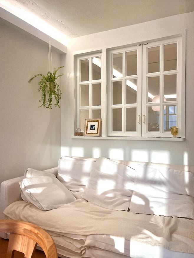 화이트 창문 앞 패브릭 쿠션에 포-옥 담긴 햇살을 보고 있으면 미소가 지어지는 순간이에요.